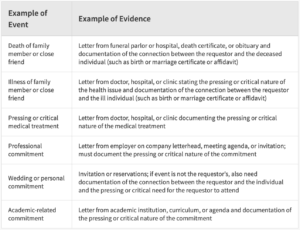 We generally require documentation to support an expedite request. Examples of evidence that may support travel-related expedite requests are outlined in the following table.
