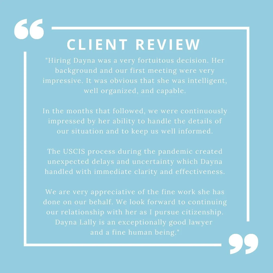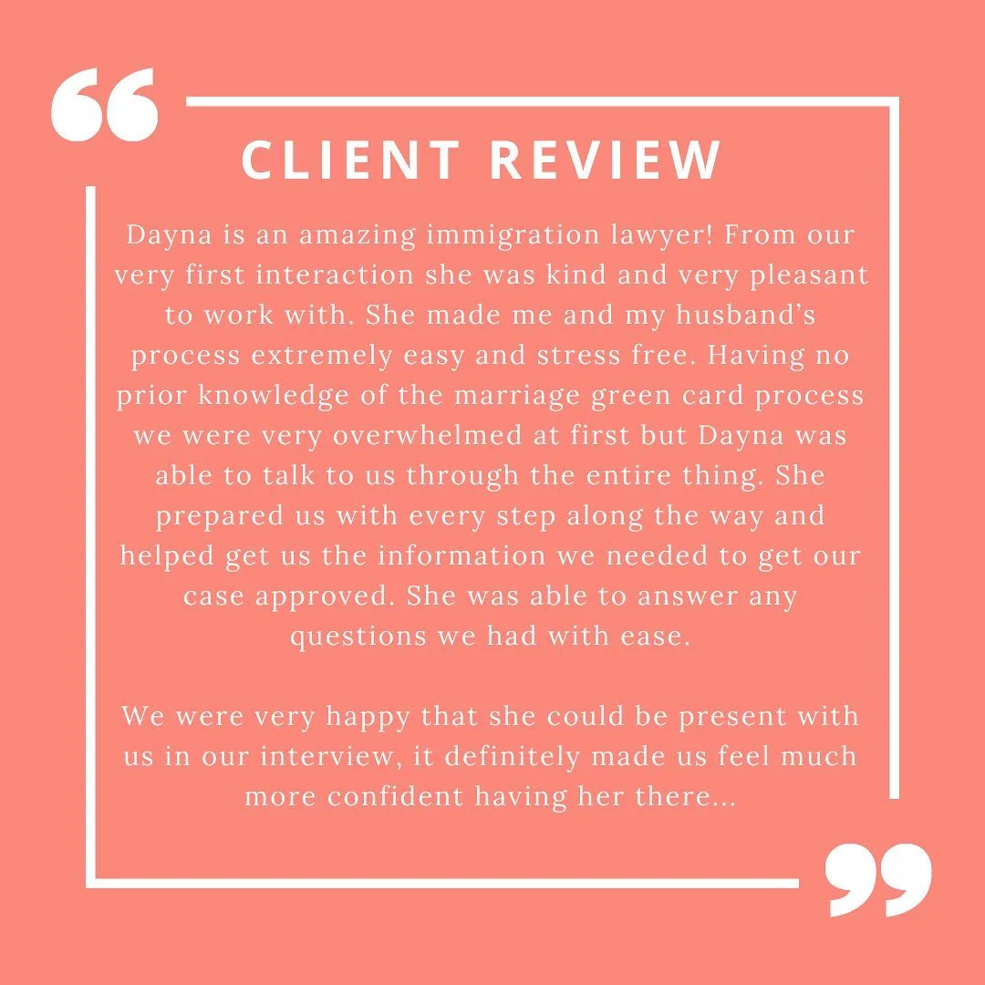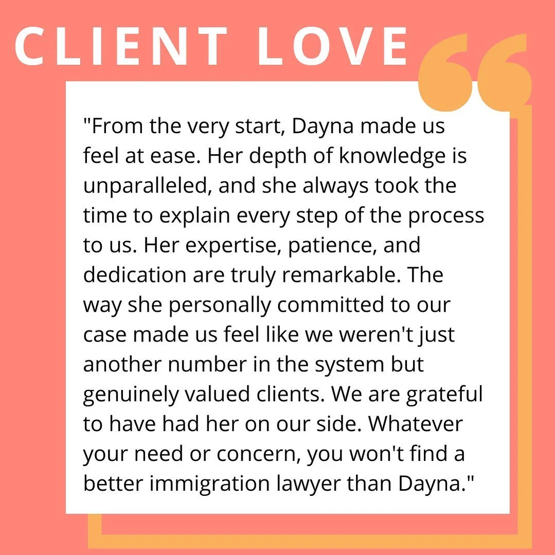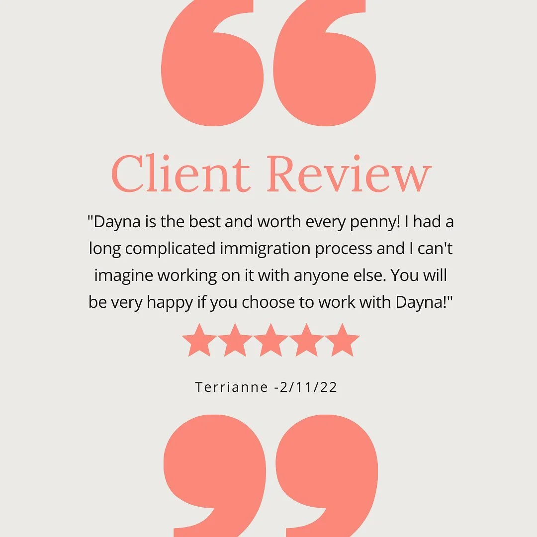 “Dayna is the best and worth every penny! I had a long complicated immigration process and I can’t imagine working on it with anyone else. You will be very happy if you choose to work with Dayna!”