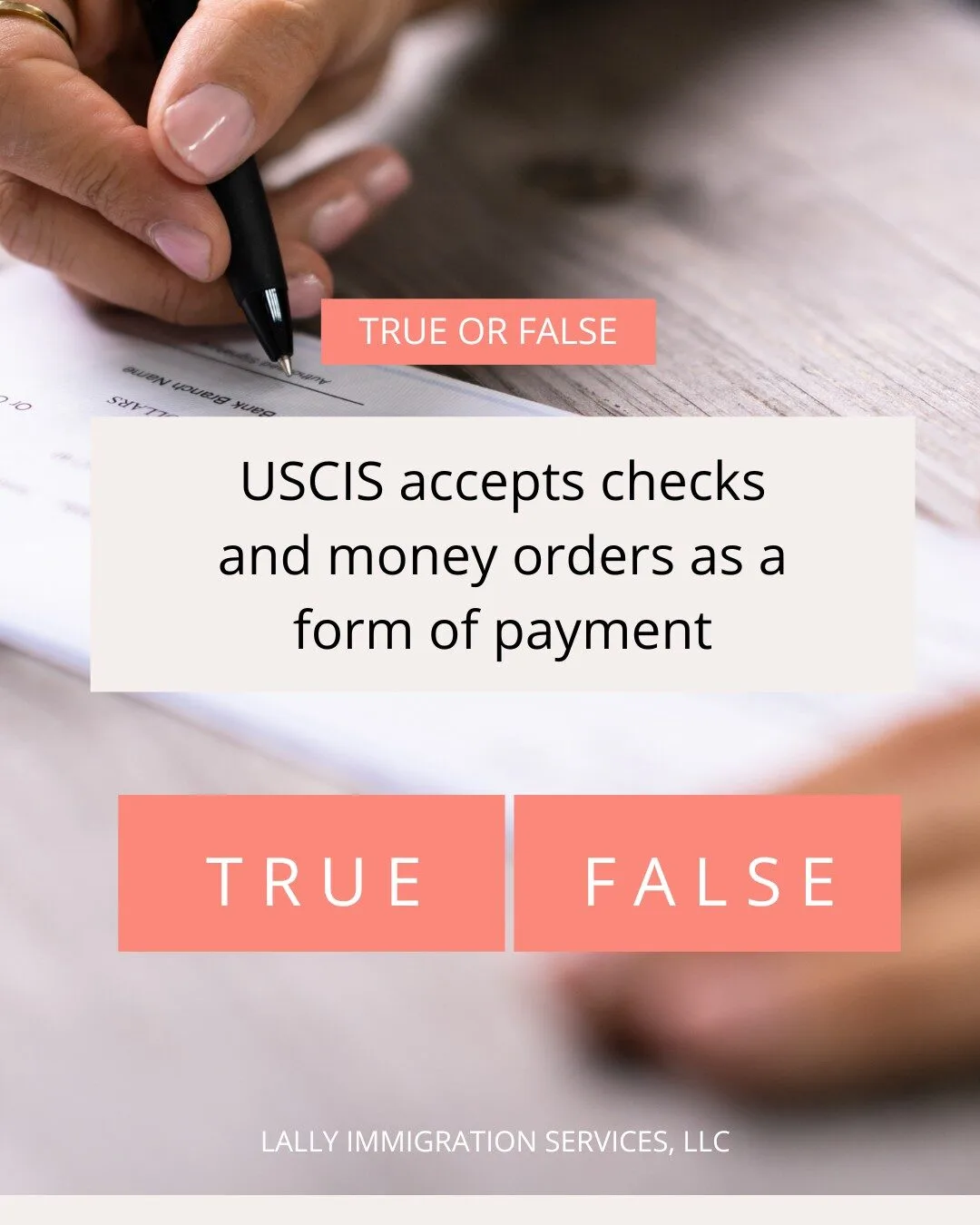 False! Following the new payment rules announced at the end of October, USCIS no longer accepts checks or money orders as payment. USCIS will accept only ACH debit transactions using Form G-1650 or credit card payments using Form G-1450. Disclaimer: This post is provided by Lally Immigration Services, LLC for informational and marketing purposes. This article does not constitute legal advice […]
